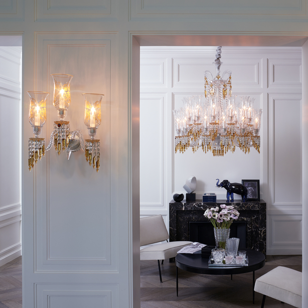 Charleston collection is inspired by the twenties’ age of splendor and prosperity. Chandeliers, floor candelabra and sconces are adorned with “champagne draped-prisms” reminding us long pearl necklaces, draped dresses of Charleston dancers. This collection also pays tribute to the creations of Georges Chevalier, his boldness and genius in particular through Jets d’eau collection. The latter is also in the history of the Maison Baccarat and its private mansion. Indeed, Marie-Laure de Noailles, the owner of this place during this period, was actively involved in the expansion of this movement conducive to creativity, art and renewal. In this spirit the Charleston chandelier has been chosen to adorn the first Baccarat Hotel in New York. The color is a main element in the creation of this new collection. "Charleston" is characterized by a champagne color that plunges us into the splendor and atmosphere of the Roaring Twenties. As the legendary gilded red, Baccarat champagne color is obtained thanks to the union of gold and crystal.