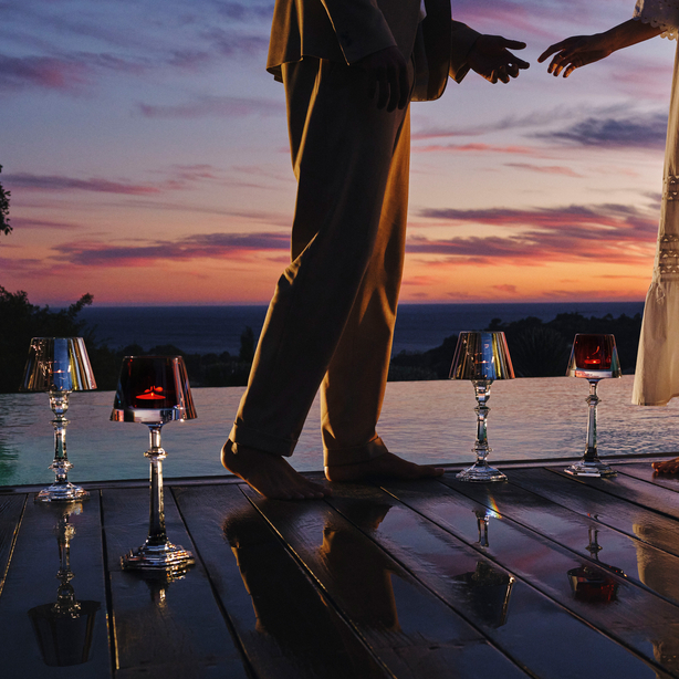 Designed by Philippe Starck, the all-crystal « Our Fire » candleholder, inspired by the celebrated Harcourt set, has become one of Baccarat’s iconic creations. The candelabra is made up of three sections: the base is a Harcourt candlestick, followed by a candleholder inspired by the form of Baccarat’s Harcourt glass, and finally a crystal lampshade with a glittering red or golden metallic finish. Light, filtered by the magic of crystal, flickers from the flame of the candle and turns into a magic glow. Also developed in black or white, each candleholder carries the « Baccarat by Starck » label.