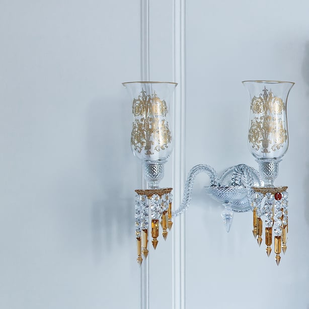 Charleston collection is inspired by the twenties’ age of splendor and prosperity. Chandeliers, floor candelabra and sconces are adorned with “champagne draped-prisms” reminding us long pearl necklaces, draped dresses of Charleston dancers. This collection also pays tribute to the creations of Georges Chevalier, his boldness and genius in particular through Jets d’eau collection. The latter is also in the history of the Maison Baccarat and its private mansion. Indeed, Marie-Laure de Noailles, the owner of this place during this period, was actively involved in the expansion of this movement conducive to creativity, art and renewal. In this spirit the Charleston chandelier has been chosen to adorn the first Baccarat Hotel in New York. The color is a main element in the creation of this new collection. "Charleston" is characterized by a champagne color that plunges us into the splendor and atmosphere of the Roaring Twenties. As the legendary gilded red, Baccarat champagne color is obtained thanks to the union of gold and crystal.