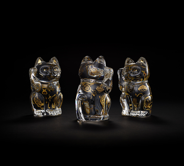 A contemporary talisman, messenger of protection and good fortune. The crystal Maneki-neko reinterprets the famous Japanese lucky cat. Its raised right paw perpetuates the traditional gesture associated with prosperity. Delicately applied with a brush, its golden motifs are inspired by Japanese symbols of luck: the koban, the ancient gold coin associated with wealth; lucky flowers associated with growth; and sparkling elements reminiscent of the benevolence of good stars.