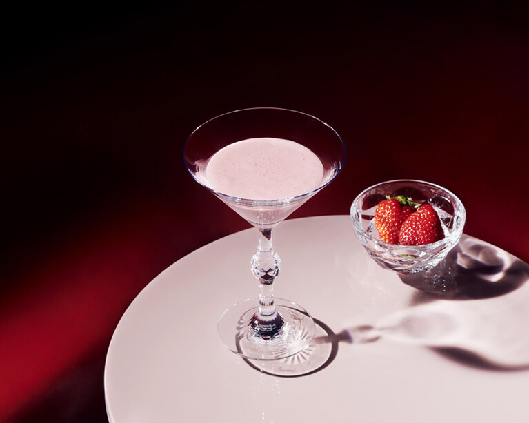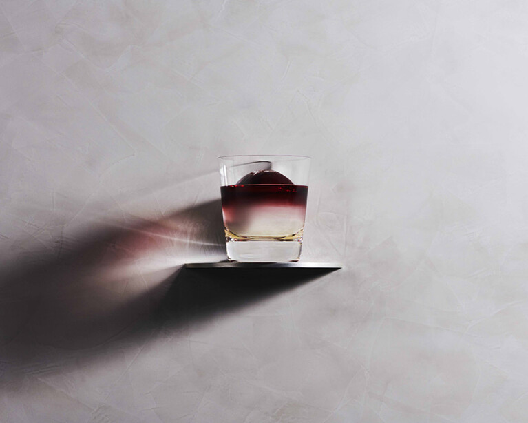An original cocktail made with Muscat, a aromatic sweet white wine, and a rich red wine, the two layers of the cocktail contrast beautifully with the round ice cubes engraved with the B mark.
