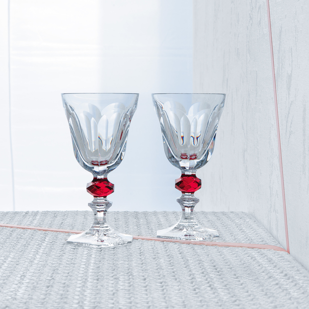 Paying tribute to King Louis-Philippe, in 2013 Baccarat re-issues the glass commissioned by the sovereign in 1840. An authentic allegory of crystal, this glass boldly underlines all Harcourt codes: the dazzling shine of the faceted crystal, the elegance of the stem with two knobs and the strength of the hexagonal foot. The faceted red knob and the pattern cut under the foot bestow it with unequalled presence.