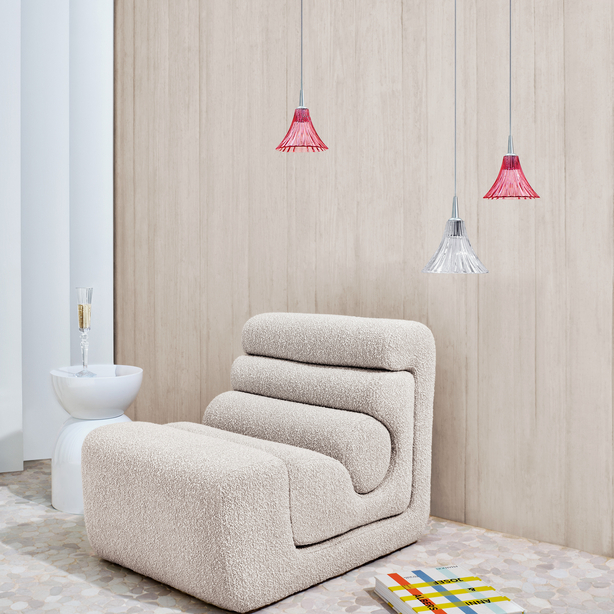 This Baccarat crystal ceiling lamp is available in three colors, with nuances that glimmer whether or not the lamp is illuminated. Its tulip shape enhances the light-scattering properties of the Mille Nuits form. The silhouette gradually fans out, as though blossoming from the suspended tubing. Easily integrated into any interior, the light scintillates magnificently. The amber lamp has brown and yellow undertones; the red lamp, Baccarat’s signature hue, has blue and purple undertones. The Mille Nuits gold lamp has a specially- applied metallic sheen. Designed by Mathias for Baccarat, Mille Nuits is a reference to the 1001 Tales of The Arabian Nights. The Mille Nuits collection includes other lighting fixtures (candelabras, chandeliers), and bar and tableware (tumblers and plates).